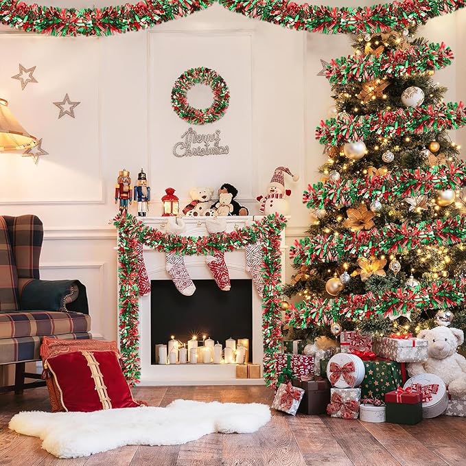 50Ft Christmas Tinsel Garland - Red Green Shiny Metallic Twist Decor for Christmas Tree Home Stairs Railing Front Door Mantle Fireplace Indoor Outdoor Holiday Party
