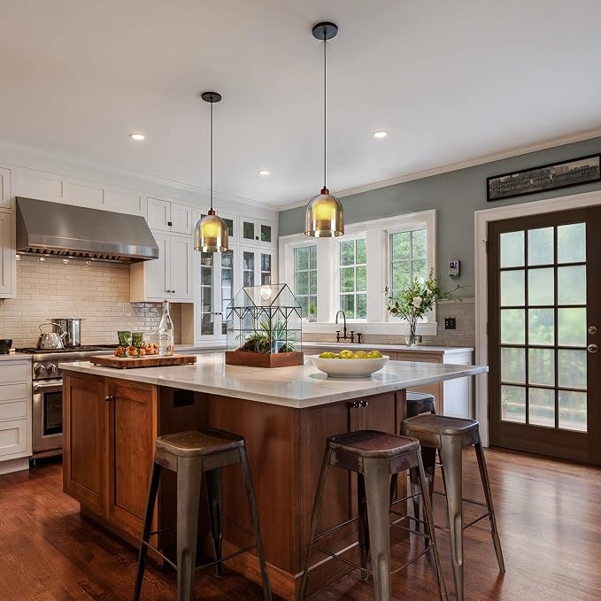 - Unique Design: Large pendant light stands out with a double-layer glass design. Inner frosted glass softens light for a warm, non-glaring atmosphere. Outer amber thickened glass cover adds artistic sense and warm light reflections, enhancing space charm