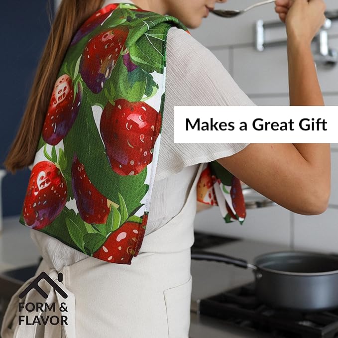 - 🍓 ELEGANT AND AESTHETICALLY PLEASING DESIGNS: This 2-pack of aesthetic kitchen towels features vibrant and modern designs that bring a touch of charm to your kitchen. These decorative tea towels for kitchen use aren’t just for cooking—they're an easy way to enhance your space!