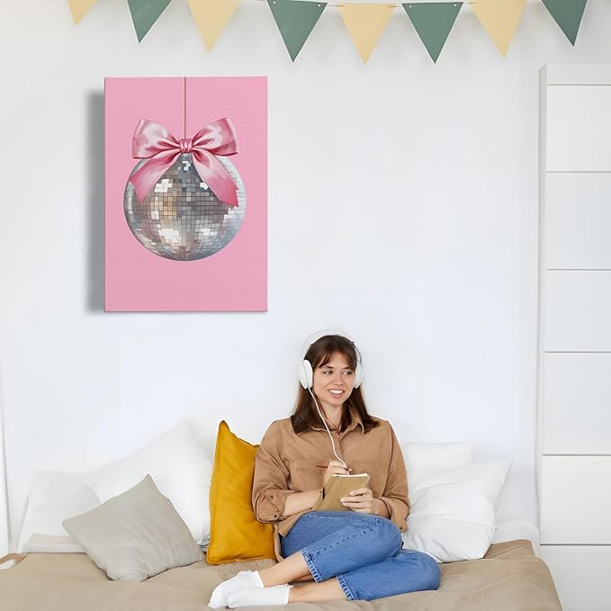 APJYM Pink Coquette Room Decor, Funky Y2K Disco Ball Preppy Wall Art, Preppy Room Decor, Trendy Retro Pink Aesthetic Posters Wall Decor for Teen Girls Bedroom Dorm Apartment Decor, 16x24 Inches Framed