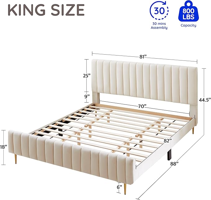 Livinia King Size Elton Velvet Platform Bed, Upholstered Bed Frame with Vertical Channel Tufted Headboard Footboard, Strong Wood Slats, No Box Spring Needed, Ivory (King)