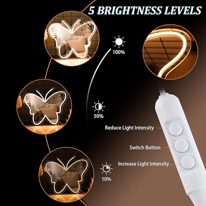 - 【Unique Neon Sign】: This innovatively designed neon mirror sign features a cute butterfly shape that not only provides ample light for makeup and shaving, but also becomes a unique room decoration. The bedroom wall mirror will create a charming atmosphere that will fascinate anime lovers.