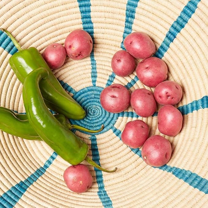 - HANDCRAFTED QUALITY: Beautiful woven construction featuring a striking turquoise and natural color pattern with intricate geometric design using natural raffia fibres and dry stalks. This basket bowl is woven by an artisan cooperative in Uganda