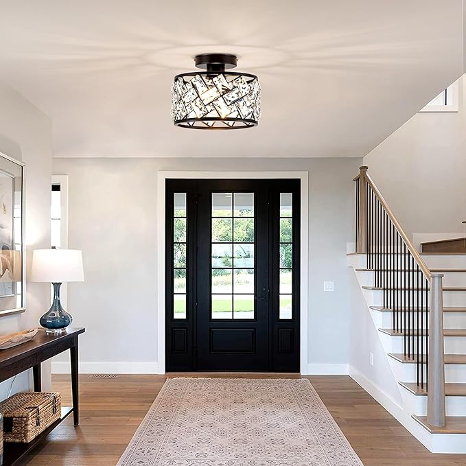 Crystal Ceiling Light Fixture, Modern Semi Flush Mount Ceiling Light,Crystal for Kitchen Bedroom Bathroom Entryway, Black Finish