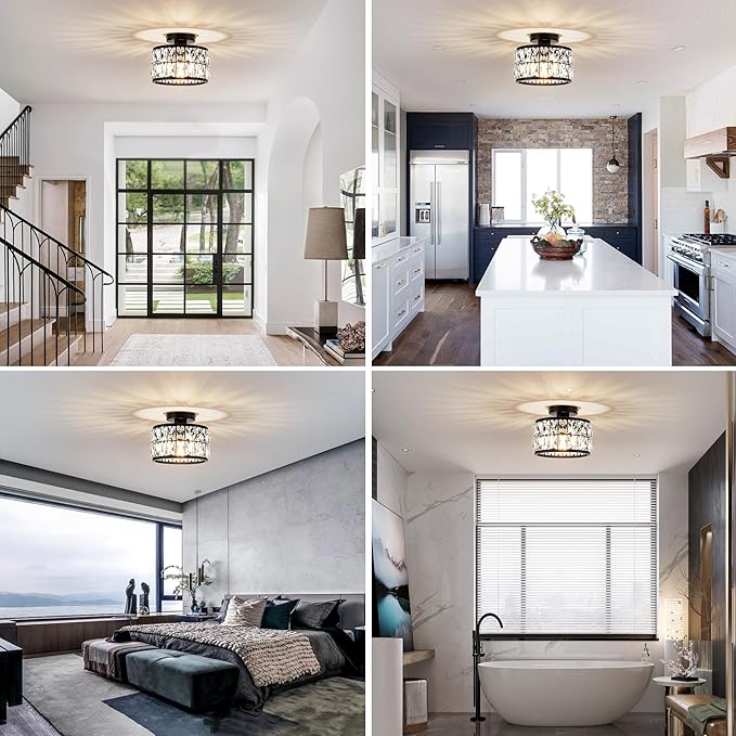 - 【Crystal Semi Flush Mount Design】This modern crystal semi flush mount ceiling light features black metal frame with crystal shade.The round metal construction and clear crystal decoration make this modern crystal ceiling light simple and luxurious yet elegant, while also reflecting the colorful light around the room in a clever way. Creating a comfortable and elegant atmosphere in your home.