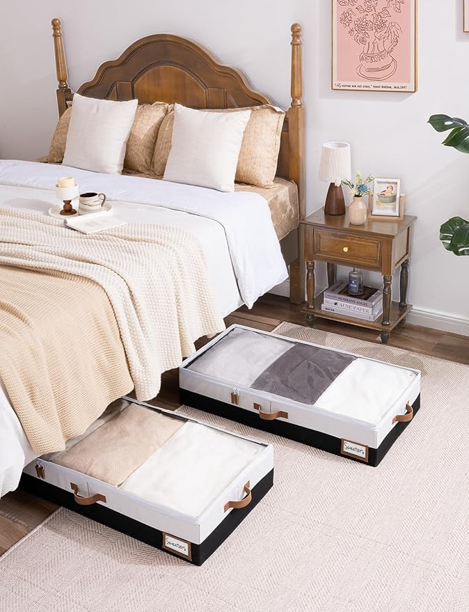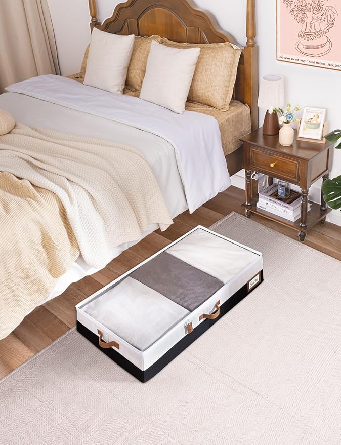- Underbed storage box featuring thick PU handles on 3 sides for easy accessing, carrying, and retrieving.