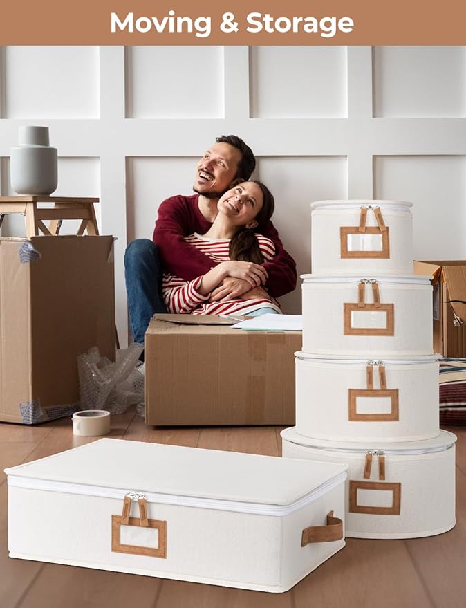 StorageWorks China Storage Containers, Hard Shell China Storage Boxes for Dishes, Plates and Mugs, Stemware Storage Cases, Holds up to 12 Place Setting, Foldable and Stackable Organizer, 5 Pack, Beige