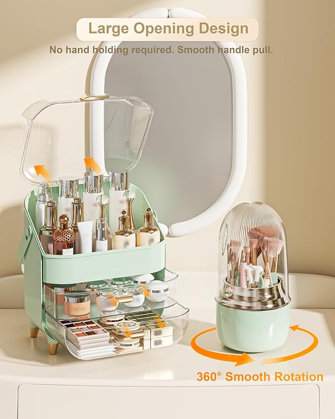 - 【Stylish and Elegant】Beautiful rounded appearance. Adopting professional top design, suitable for any home and women's style. This makeup box is elegant on vanity, bedroom, dresser, countertop, bathroom. Delicate colour is suitable for any room decoration.