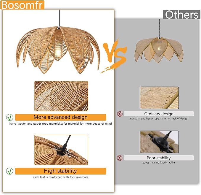 - Easy Installation: Boho rattan chandelier is hand woven with loose packaging of blades.The rattan hanging light set is equipped with 9 individually packaged handwoven petals(6 pieces outside, 5 pieces inside), 55.11 inch cord (can be adjusted). All you need to do is install the handwoven petals on the lamp holder in turn according to the installation instructions and pictures, connect the light bulbs, and then fix the chandelier on the ceiling, and you can enjoy the beautiful boho pendant light