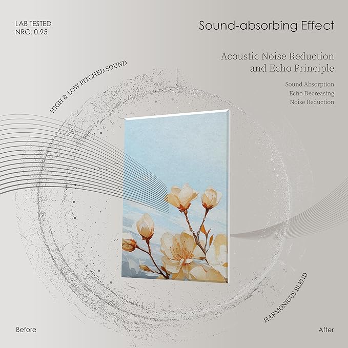 - PREMIUM SOUND CONTROL -- Serious about acoustic treatment? Avoid acoustic foam. Our art acoustic panels, sized at 16 x 12 inches each, come in a 8-pack and offer superior noise dispersion and echo elimination, enhancing your sound experience and room decor.