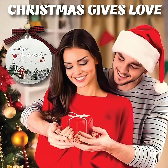 - Charming Design: This round ornament features a quaint winter village scene with snow-covered houses and pine trees, evoking a cozy, nostalgic feel. The phrase "I wish you lived next door" adds a personal and heartfelt touch, making it perfect for gifting to loved ones.