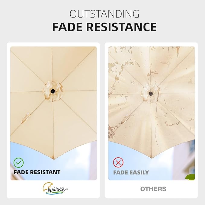 - EASY TO ADJUST: Open, close and tilt the umbrella with ease! Wikiwiki market umbrella is designed with a crank system for easy opening and quick use. Push button tilt allows for more angles of shade protection and allows for coverage all day.