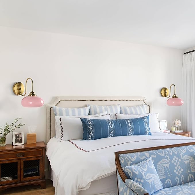 - Aesthetic Pink Glass Shade: The modern farmhouse gold wall sconce light features a metal body with brushed brass finish and pink glass lampshade, adding artistic beauty and decorative value. When you turn on the light, the light radiates a cozy glow through the glass shade, making it the perfect choice for your home lighting fixture