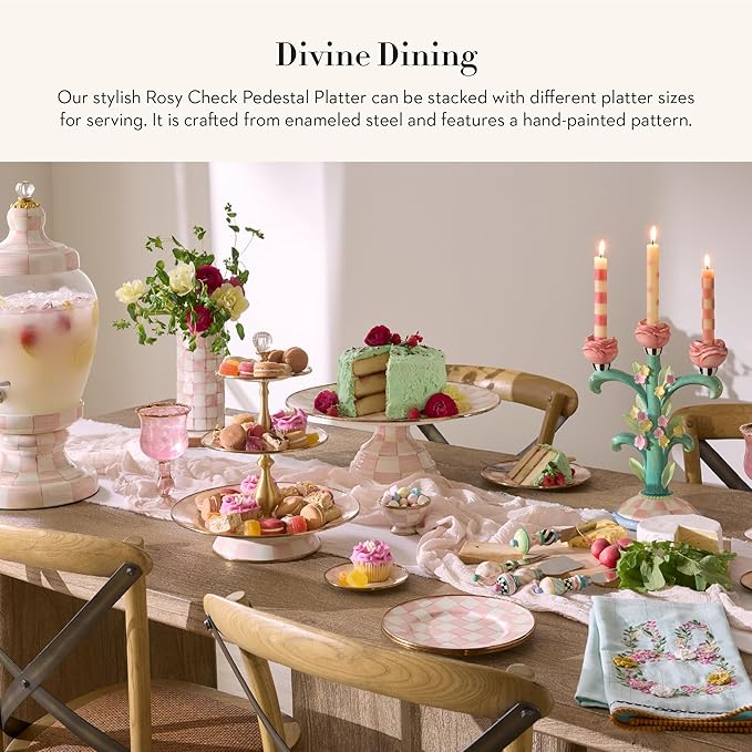 MACKENZIE-CHILDS Enamel Pedestal Platter, Round Cake Stand, Large, Pink-and-White Rosy Check