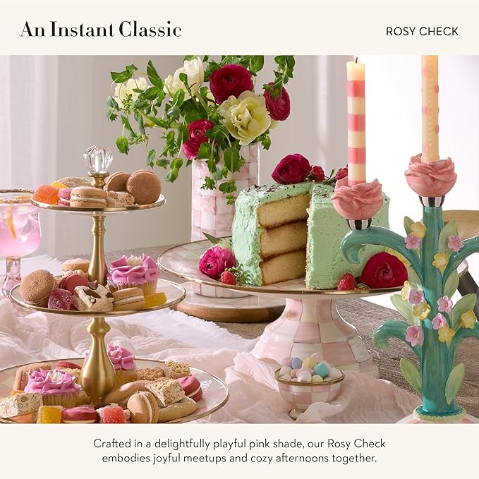 - SERVING ESSENTIAL: A cake or cupcake stand doesn’t get any more classic than this. This serving dish features a hand-glazed heavy-gauge steel underbody, a bronzed stainless-steel rim, and our pretty pink-and-white Rosy Check pattern.
