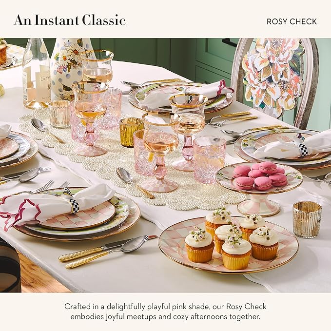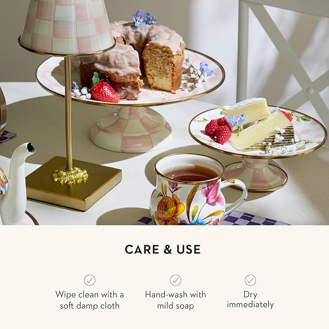- SERVING ESSENTIAL: A cake or cupcake stand doesn’t get any more classic than this. This serving dish features a hand-glazed heavy-gauge steel underbody, a bronzed stainless-steel rim, and our pretty pink-and-white Rosy Check pattern.