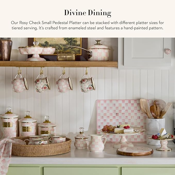 MACKENZIE-CHILDS Enamel Pedestal Platter, Round Cake Stand, Small, Pink-and-White Rosy Check