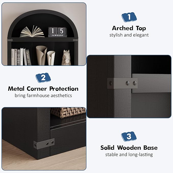 - Modern Elegance Meets Farmhouse Flair: This tall bookcase combines an arched top with a rich natural wood grain to showcase a perfect blend of modern strength and rustic beauty, complemented by stylish metal corner protection that not only enhances its rugged charm but also ensures longevity and resilience against daily wear and tear, making it a complement to any decor style, from rustic to contemporary, this bookcase serves as a focal point for any room.