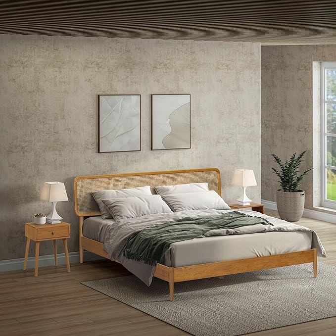 NTC Lupin Wooden Bed Frame with Headboard and Natural Rattan, Solid Oak/Rubber Wood Foundation with Silent Slats, 1000 Lb Capacity, Effortless Assembly (Natural Cane - Rustic Oak, King)