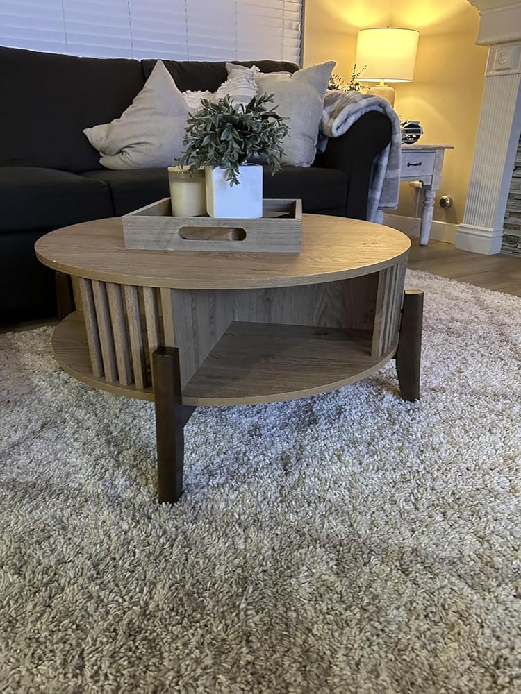- Mid-Century Coffee Table with Storage: This 31.5” round coffee table features a textured oak wood grain finish and solid rubberwood legs, adding a stylish mid-century touch to your space. Its versatile design complements various living room furniture and decor.