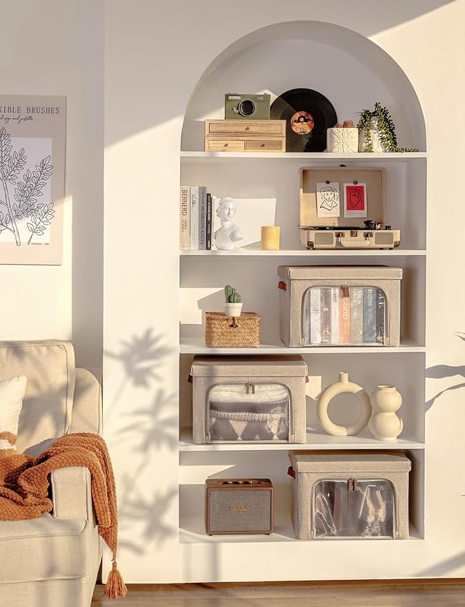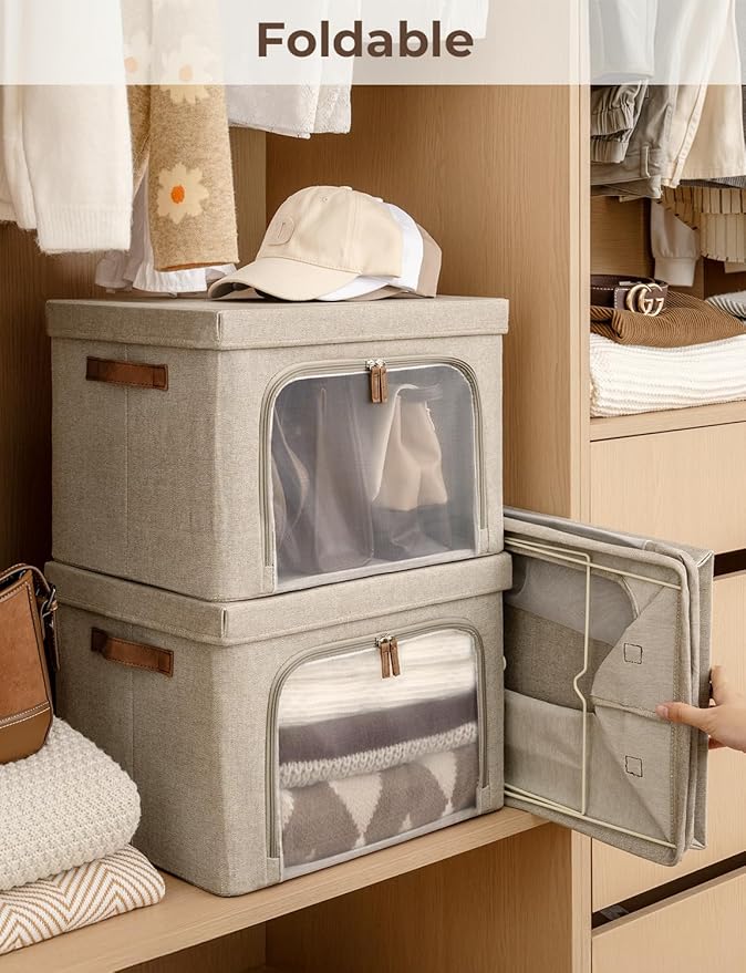 StorageWorks Storage Bins with Lids, Decorative Boxes with Clear Window for Clothes, Fabric Collapsible Baskets for Closet Organization, Large, Brown, 3 Packs