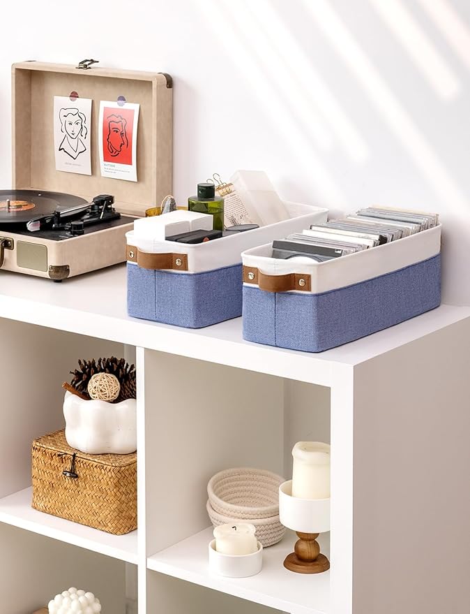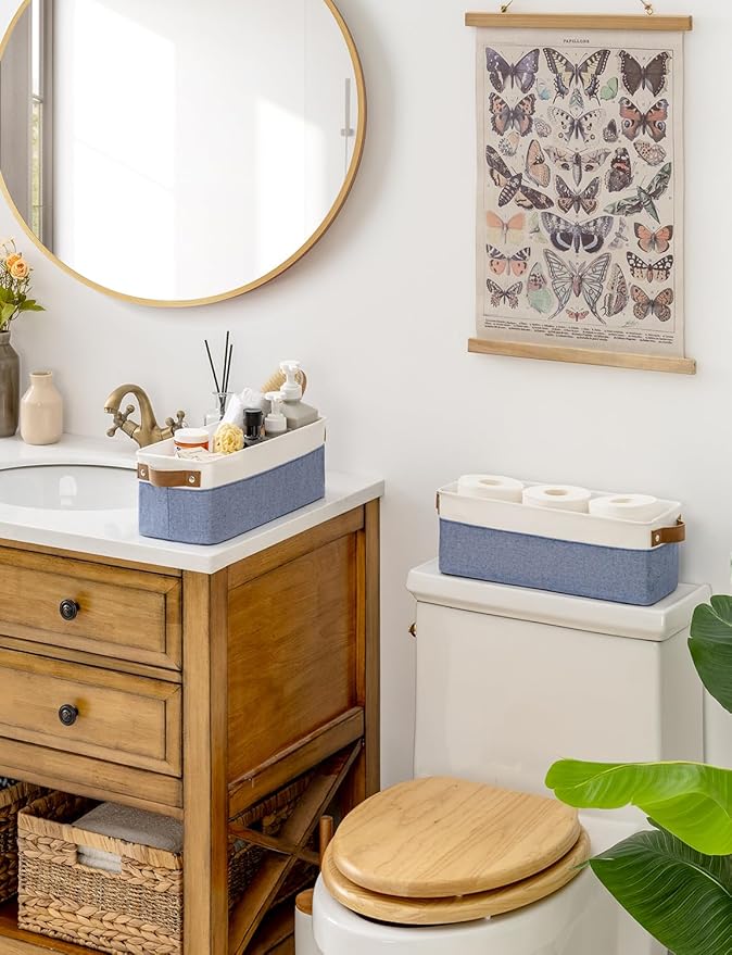 StorageWorks Narrow Storage Bins, Small Basket for Closet and Shelves, Fabric Organizer with Handles, Toilet Paper Storage, Blue and White, 2-Pack