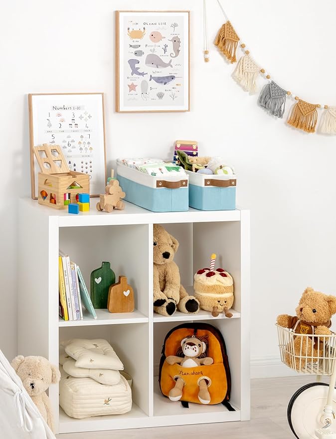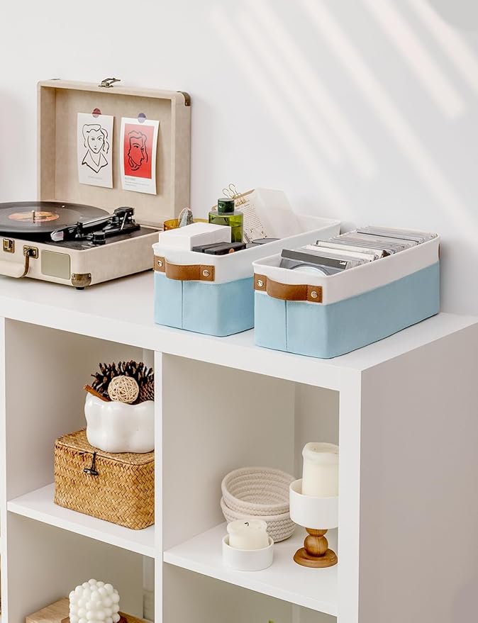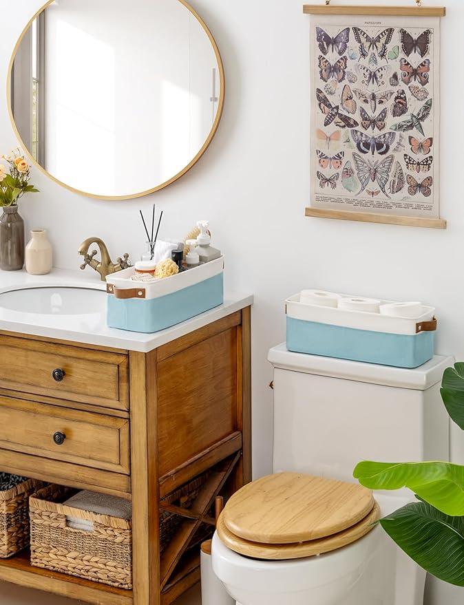 StorageWorks Narrow Storage Bins, Small Basket for Closet and Shelves, Fabric Organizer with Handles, Toilet Paper Storage, Light Blue and White, 2-Pack