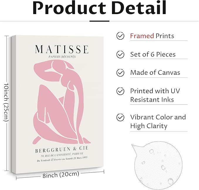 Henri Matisse Wall Art Prints Pink Blue Canvas Wall Decor Aesthetic Pictures Wall Art Danish Pastel Painting Henri Matisse Poster Trendy Artwork for Bedroom 8x10 Inch Wrapped Canvas Set of 6