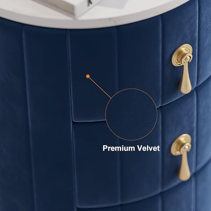 homary Blue Velvet Nightstand with Storage, Round Bedside Table with 3 Drawers, Stone Top Night Table for Bedroom, End Tables for Living Room