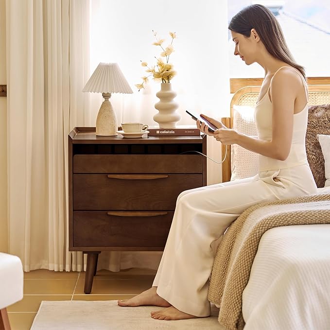 - Spacious Storage: This nightstand offers three versatile drawers—a top drawer designed with cable cutouts for organized charging, two sliding drawers with solid wood veneer for private storage for quick-access items, making it ideal for bedrooms, offices, or living rooms.