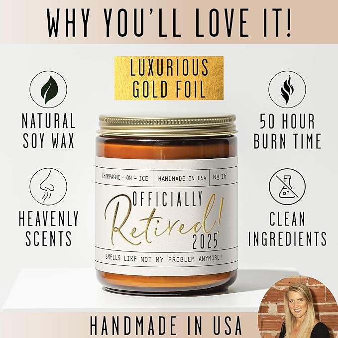 - RETIREMENT CANDLE WITH SOY WAX FOR AN ECO-FRIENDLY CLEAN BURN - each 9oz candle is hand poured in the USA using an all-natural blend of 100% Soy Wax ingredients, lead-free cotton wicks & premium fragrance oils, poured into a re-usable jar - so they're good for your nose and body!