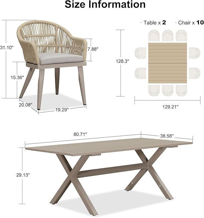 - The all-weather dining table set includes: 2 X dining table (80.71"L x 38.58"W x 29.13"H), 10 X dining chairs (19.69"L x 18.5"W x 29.33"H), and 10 X cushions.