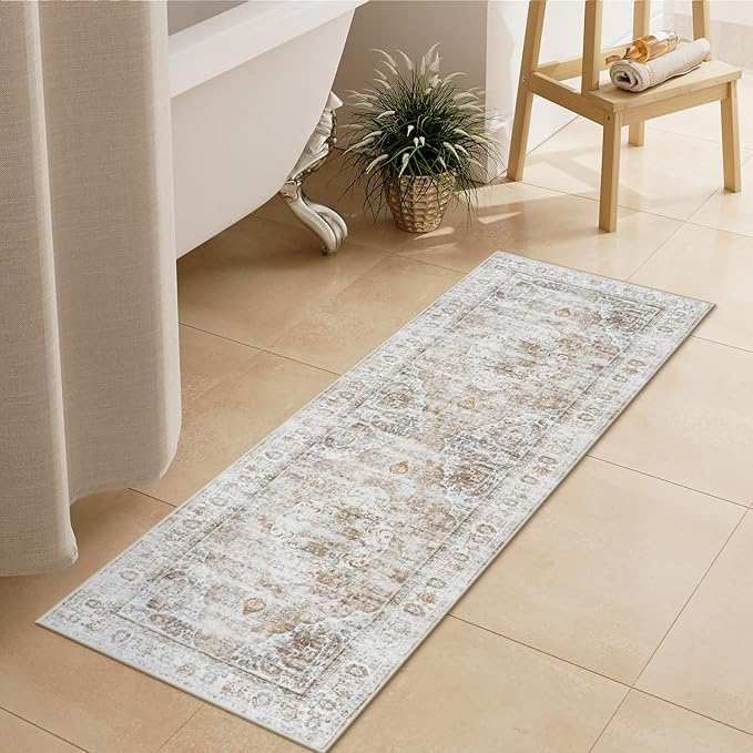 Uphome Bathroom Rugs Runner, Distressed Farmhouse Boho Light Khaki Bath Mat, Non Slip Washable Long Bath Rugs, Vintage Traditonal Soft Velvet Bathroom Runner for Bathtub Sink Shower, 18x47 inch