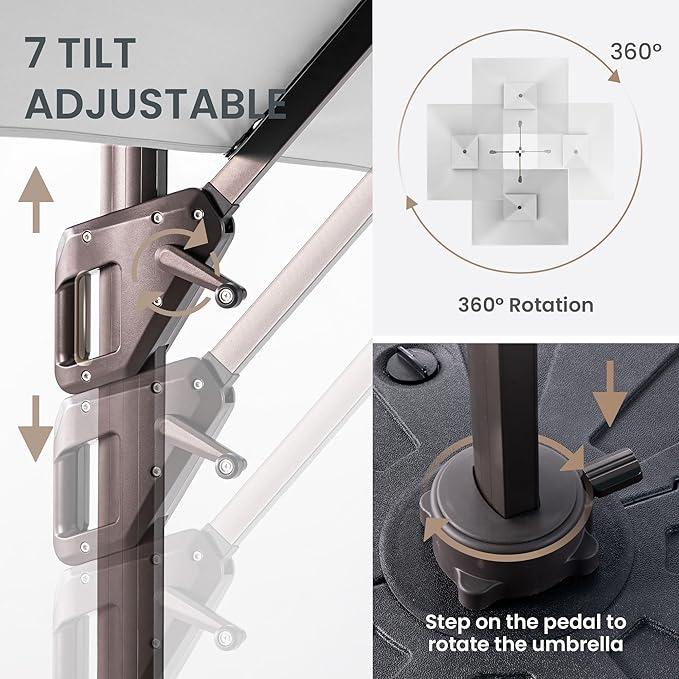 - 360°Rotation and 7 Tilt Adjustable: By stepping on the foot pedal, the outdoor umbrella can be rotated 360°horizontally; The integrated crank system makes the patio umbrella easy to open and close, 7 tilt adjustment can provide multi-angle shading needs