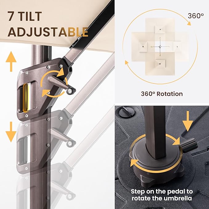 - 360°Rotation and 7 Tilt Adjustable: By stepping on the foot pedal, the outdoor umbrella can be rotated 360°horizontally; The integrated crank system makes the patio umbrella easy to open and close, 7 tilt adjustment can provide multi-angle shading needs