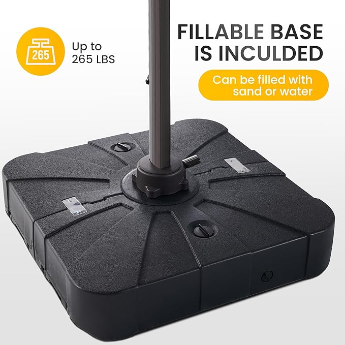 - Patio Umbrella with Base Included: The outdoor cantilever umbrella includes a weighted base, The base can be filled with sand or water, weighs up to 265 lbs with water and 440 lbs with wet sand after fully filled; The base will be delivered separately, so you won't receive both the umbrella and the base at the same time