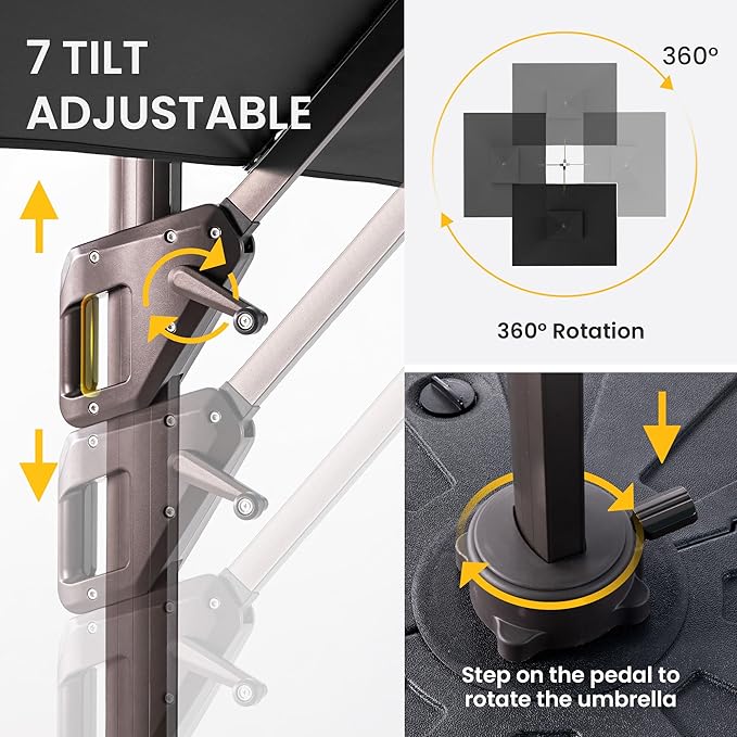 - 360°Rotation and 7 Tilt Adjustable: By stepping on the foot pedal, the outdoor umbrella can be rotated 360°horizontally; The integrated crank system makes the patio umbrella easy to open and close, 7 tilt adjustment can provide multi-angle shading needs