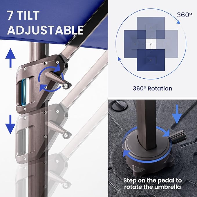 - 360°Rotation and 7 Tilt Adjustable: By stepping on the foot pedal, the outdoor umbrella can be rotated 360°horizontally; The integrated crank system makes the patio umbrella easy to open and close, 7 tilt adjustment can provide multi-angle shading needs