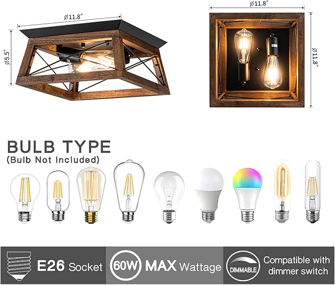 - 【Compatible with Various Bulbs】- Designed to work with E26 base bulbs (LED, incandescent, or Edison bulbs), giving you flexibility in choosing brightness and ambiance. Dimmable with a compatible switch (bulbs and dimmer not included).