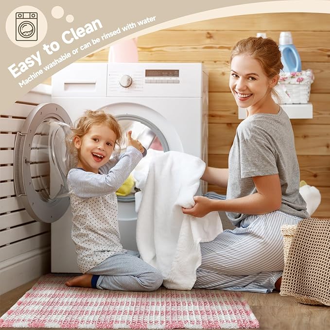 Waffle Runner Rug Bathroom, Long Boho Bathroom Rugs Non Slip Washable Absorbent Checkered Bathroom Mat Quick Dry Cute Bath Mat, 60"x24" Pink and White