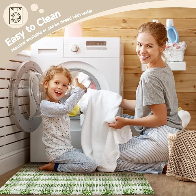 Waffle Runner Rug Bathroom, Long Boho Bathroom Rugs Non Slip Washable Absorbent Checkered Bathroom Mat Quick Dry Cute Bath Mat, 72"x24" Green and White