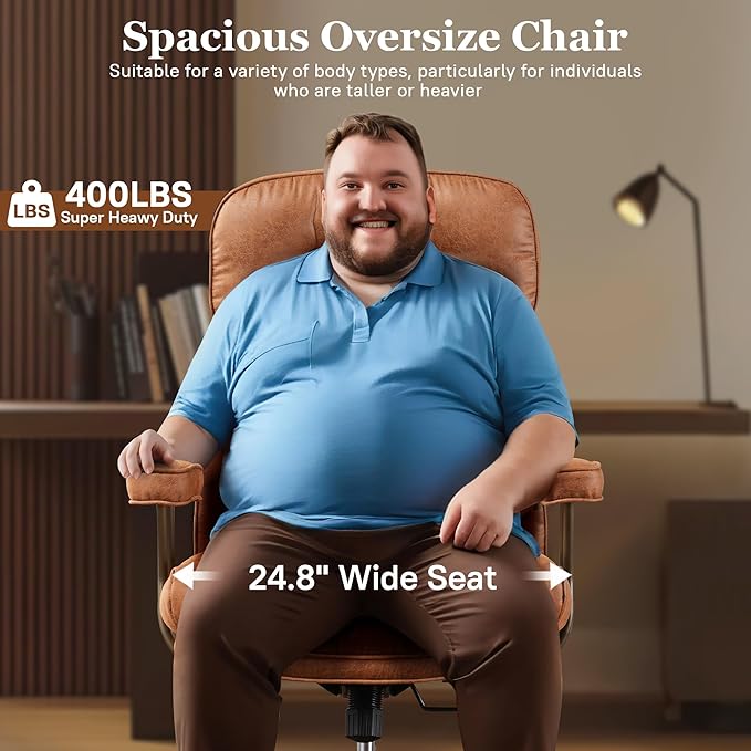 Mid Century Modren Big and Tall Office Chair,Large Ergonomic Executive Chair for Heavy Duty People, Desk Task Chair with Wheels, Faux Lether Fabric Wide Chair for Home Sturdy,Brown(Suede)