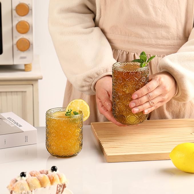 - [Versatile for All Beverages]: 2 Sizes for Every Occasion. This set includes two practical sizes to suit different drinks: 12oz vintage glassware: Ideal for beer, iced tea, juice, soda, milk or water—great for everyday use. 10oz water glasses: Perfect for cocktails, whiskey, espresso, or wines—adding elegance to your drink experience. Whether for casual family meals, parties, or bar use, these glasses meet all your serving needs!