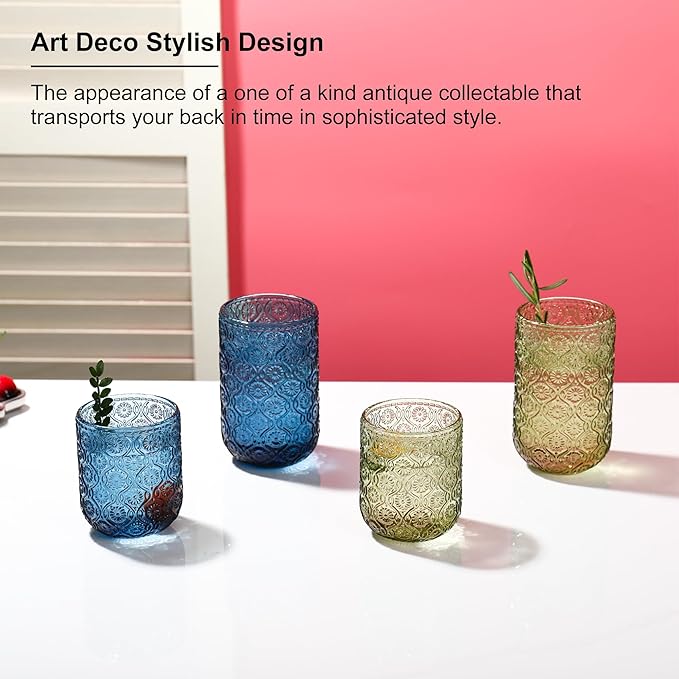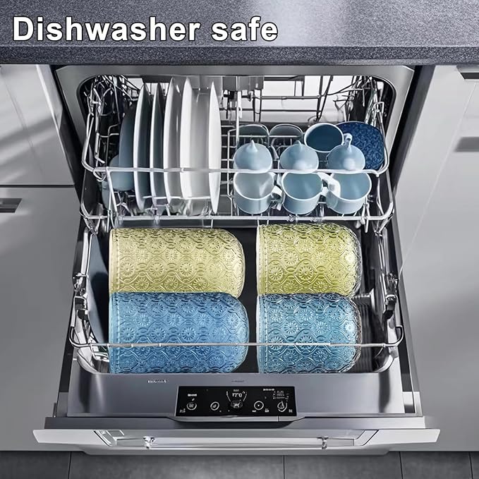 - [Dishwasher Safe & Fade-Resistant]: Unlike many glass cups that peel or fade in the dishwasher, our colored drinking glasses are designed with long-lasting, high-temperature-resistant finishes. Simply place these highball glasses in the dishwasher—no hand-washing required! The embossed patterns won’t wear off, saving you time and effort while keeping your glasses looking brand new.