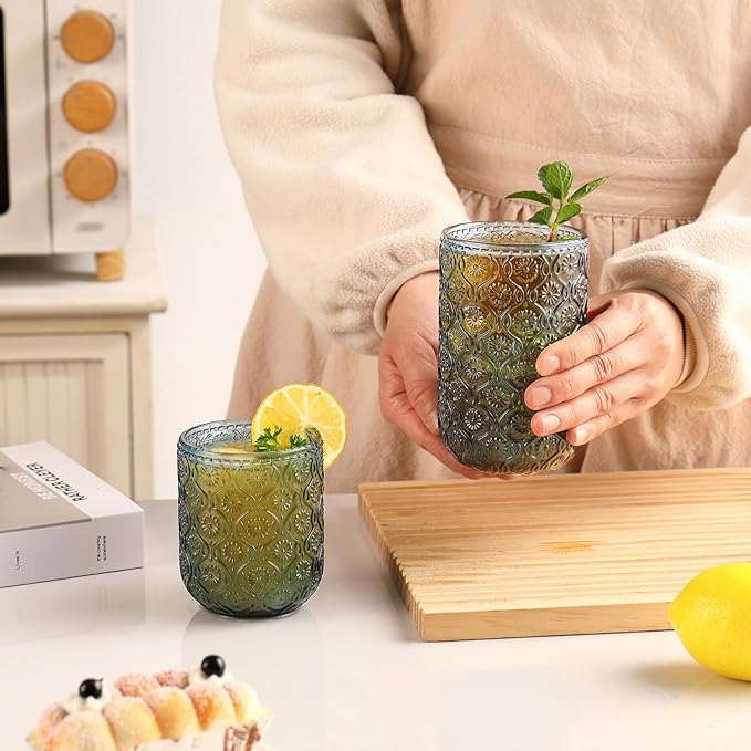 - [Versatile for All Beverages]: 2 Sizes for Every Occasion. This set includes two practical sizes to suit different drinks: 12oz vintage glassware: Ideal for beer, iced tea, juice, soda, milk or water—great for everyday use. 10oz water glasses: Perfect for cocktails, whiskey, espresso, or wines—adding elegance to your drink experience. Whether for casual family meals, parties, or bar use, these glasses meet all your serving needs!