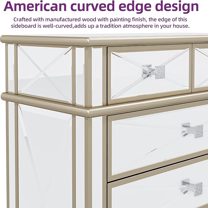 - Gloss Mirrored Glass Design: The modern design of the Mirrored 5-Drawer Chest of Drawers has a glass-applied body with a full mirror finish to make your room more spacious and bright.. It is also waterproof and easy to clean. Which is also waterproof and easy to clean.