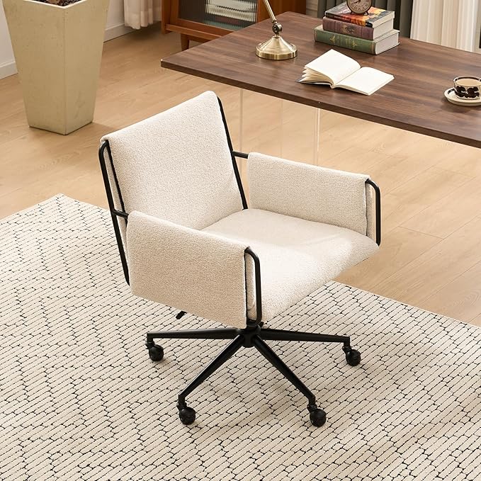 Rowill Modern Office Chair, Beige Boucle Fabric, Adjustable Height, 300 LBS Capacity, Wheels, Arm Rest, Perfect for Home Office, Bedroom, Makeup Room