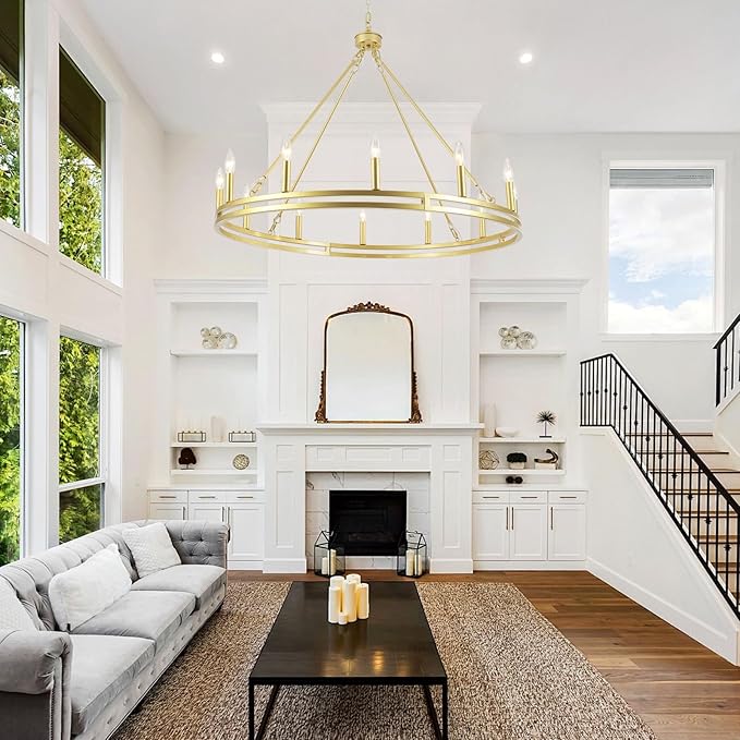 12-Light Wagon Wheel Chandelier 38 inch Large Gold Chandeliers for High Ceilings Round Farmhouse Gold Light Fixtures Over Table Rustic Hanging Light for Dining Room,Foyer,Living Room,Outdoor