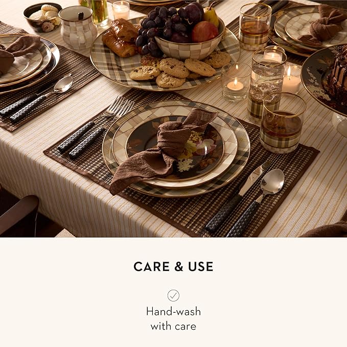 MACKENZIE-CHILDS Set of 4 Tumbler Glasses, Glass Drinkware with Gold Rims, 12 Ounces, Brown-and-White Tartan Mocha