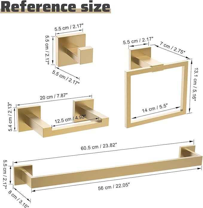 TNOMS 5-Piece Towel Bar Set Brushed Gold Bathroom Hardware Accessories Set Includes Upgraded Double Base Toilet Paper Holder,Modern Square Towel Holder Set Stainless Steel Wall Mount 23.6 Inch